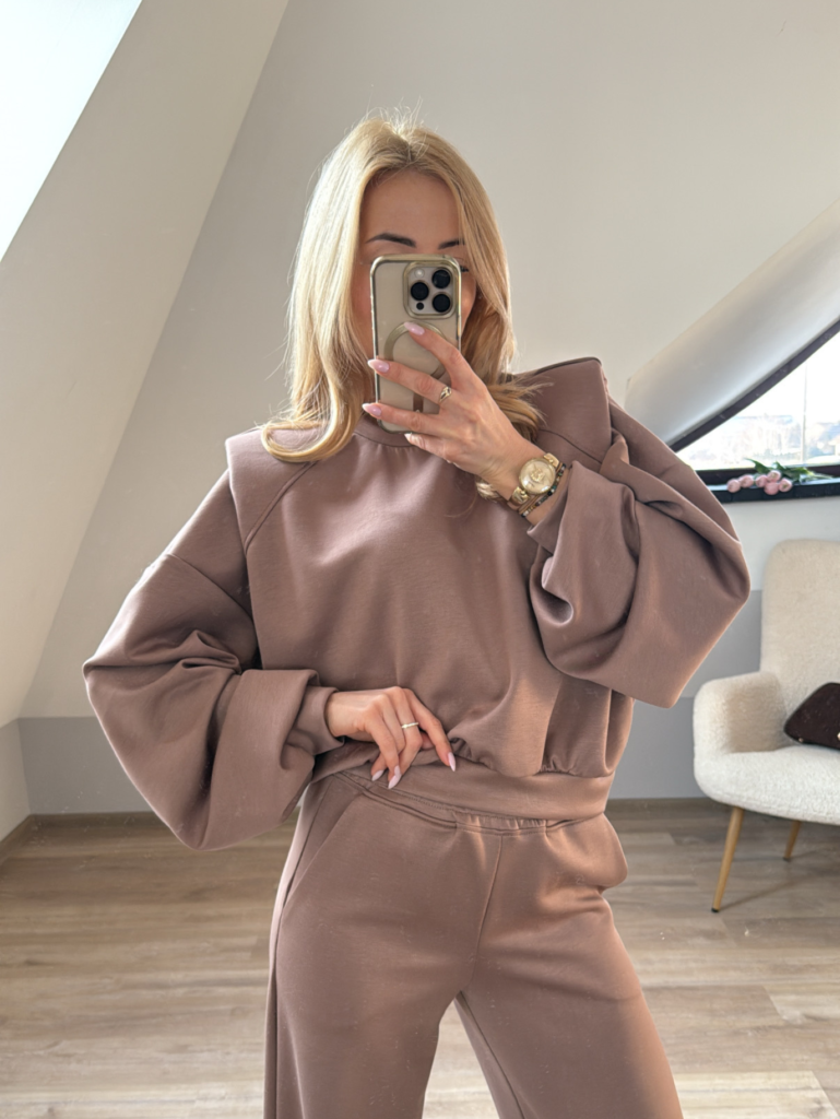 Bluza o fasonie oversize z dużymi poduszkami na ramionach , nadaje stylizacji charakteru, a spodnie o szerokiej nogawce z gumką w pasie gwarantują komfort noszenia.