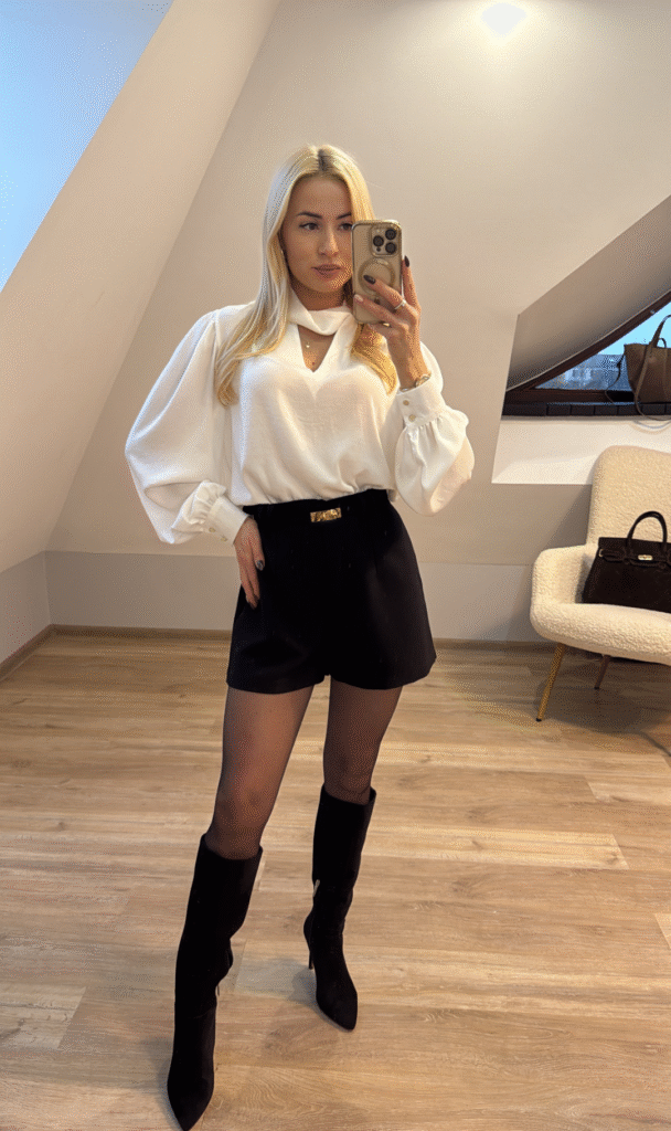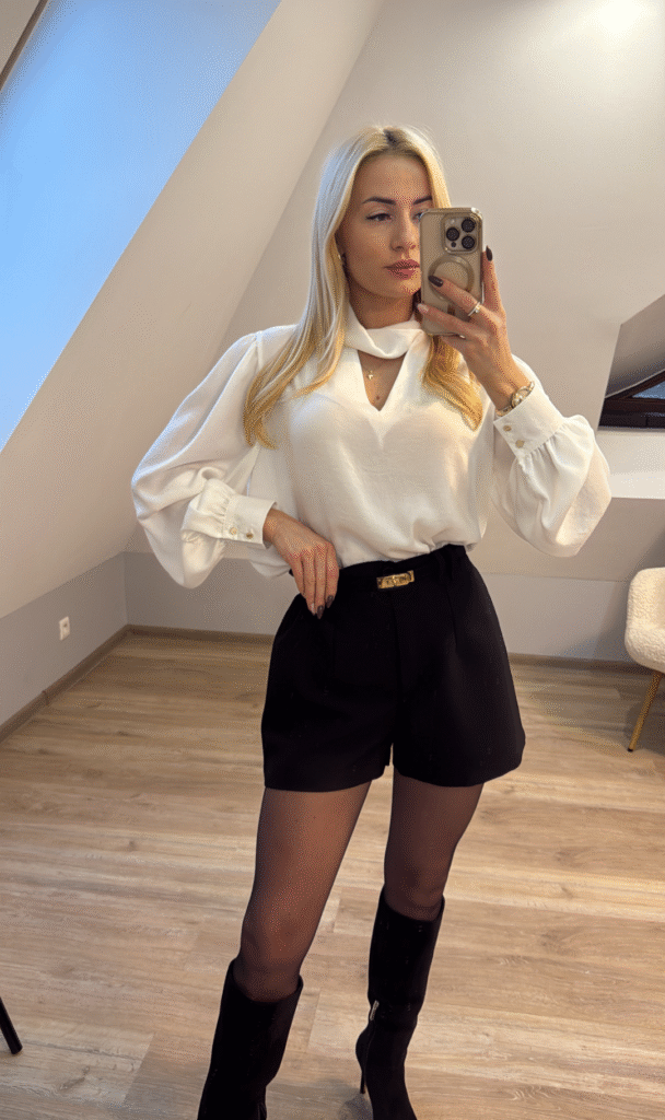 Przepiękna koszula Gloria w kolorze czarnym od Polskiego producenta o fantastycznym kroju, swobodna w noszeniu. Wykonana z eleganckiego , delikatnego materiału, który pięknie się układa . Rękawy szersze zakończone mankietem, zapinane na dwa złote guziki, przy szyi al’a półgolfik, delikatny dekolt w V. Sprawdzi się do eleganckich stylizacji w połączeniu ze spódnicą lub eleganckimi spodniami.