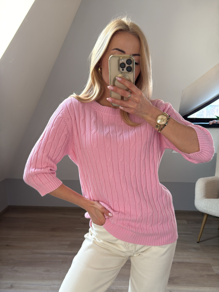 Stylowy sweterek z ozdobnym splotem warkoczowym. Prosty klasyczny model na krótszy rękaw . Wykonany z miękkiej dzianiny z wiskoza w składzie. Idealny do codziennych stylizacji.